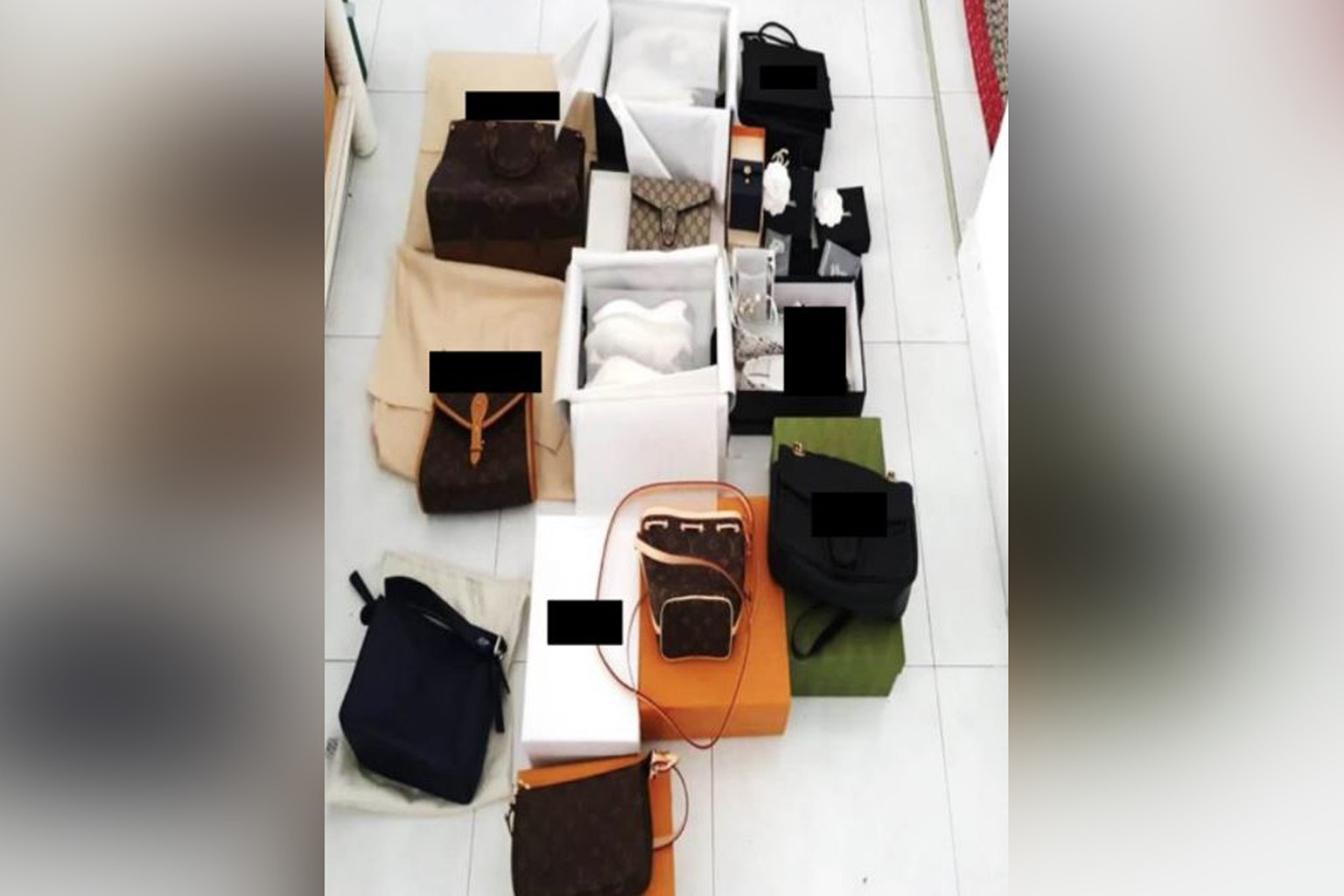 Counterfeit luxury goods, including bags, shoes and jewellery, as well as cash amounting to $4,050, were seized.