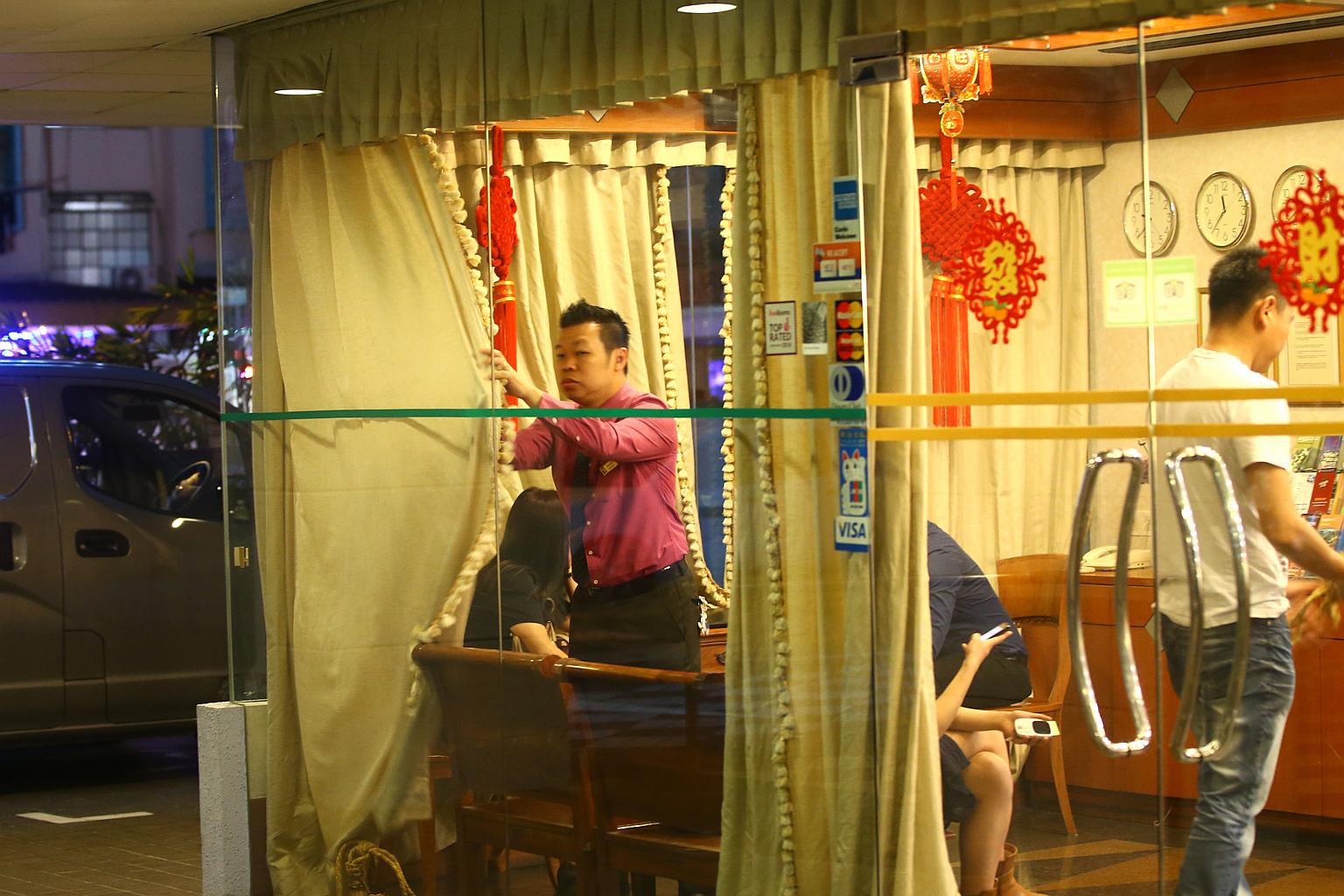 Curtains were drawn at at Hotel 81 Palace to prevent passers-by from peering into the lobby while investigations were ongoing after the bodies of Chin Nasally Baskar and Ruli Wadyawati were found in one of the rooms.