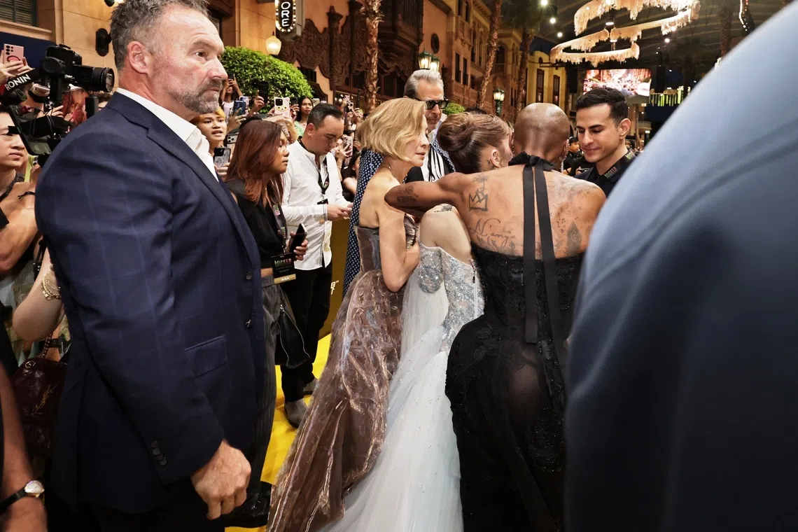 Event crasher Johnson Wen (in white) is accused of committing the offence at Universal Studios Singapore on Nov 13. During the commotion, a protective Cynthia Erivo (in black) forced herself between Ariana Grande (in light blue) and Wen, as security guards quickly nabbed him.