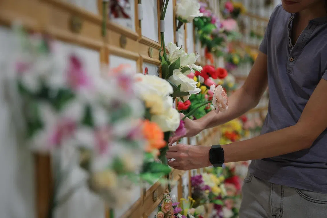 Mr Emanuel Francis adorns his sister’s niche at the Church of the Holy Spirit columbarium with lilies. She loved lilies, and she often asked him to buy the flowers for her.