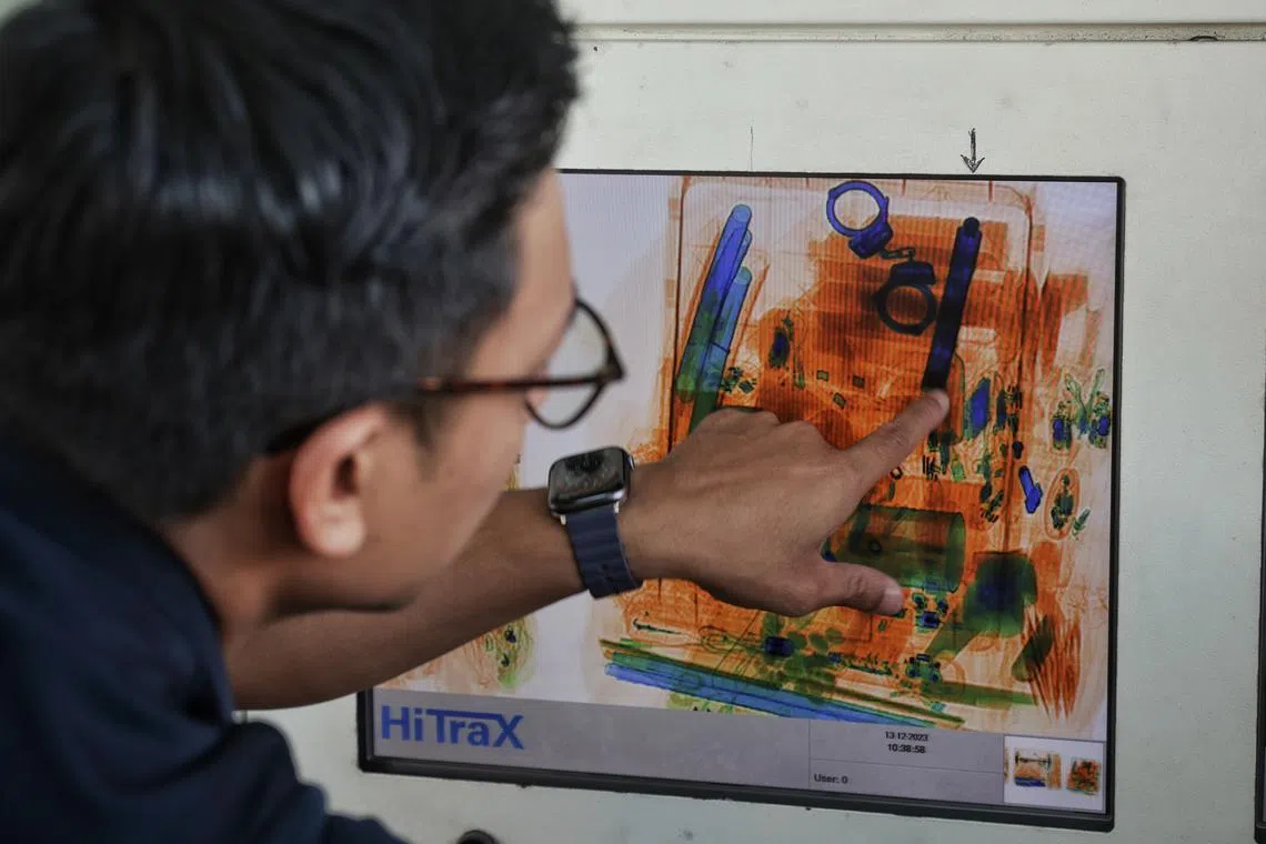 Cargo clearance officer Sergeant (2) Muhammad Haikal Mahmood told reporters: “Usually, for offensive weapons such as knuckle dusters and batons, they would be in blue colour (on the scan) as they are made with metal and have high density.”