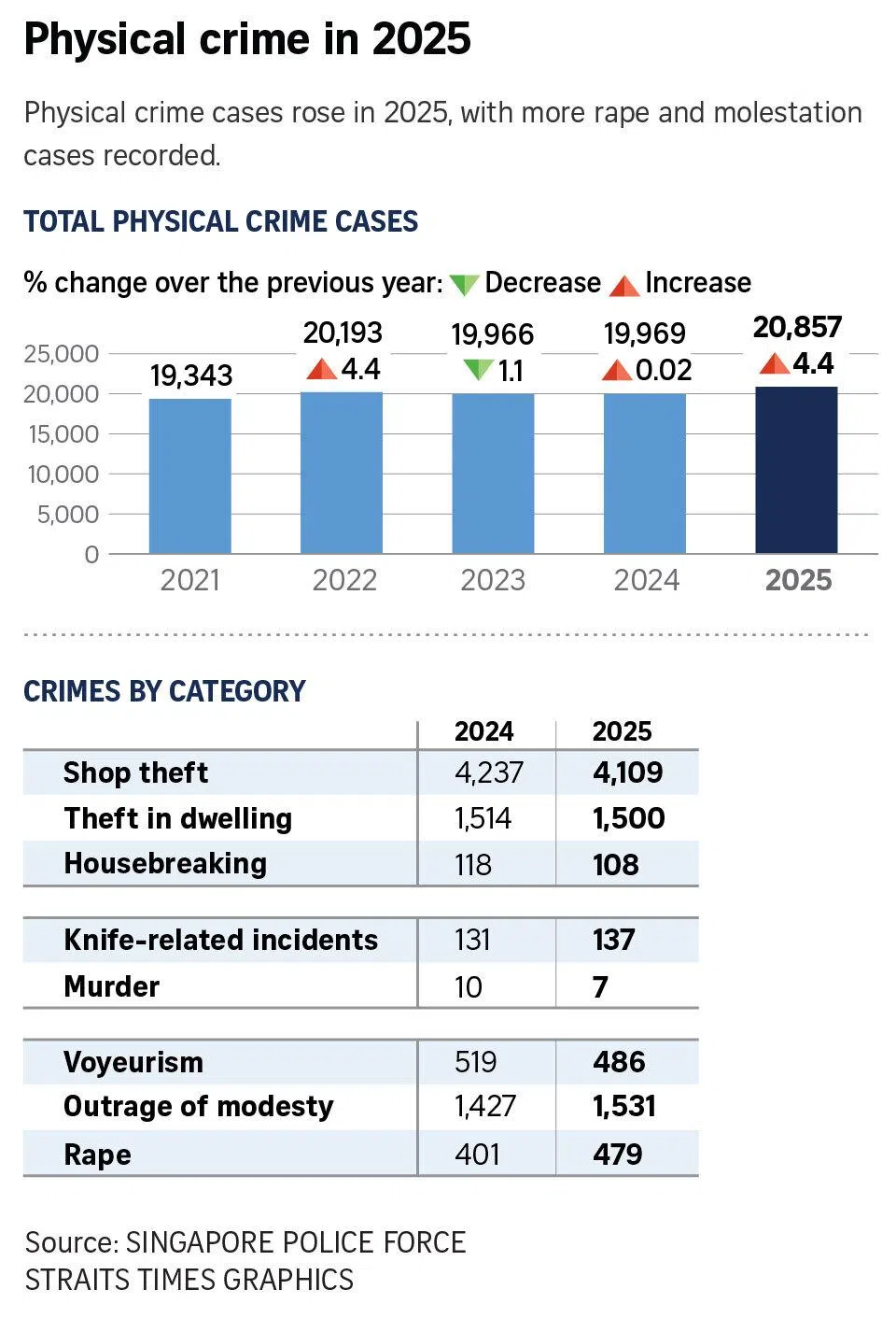 - Physical crime in Singapore rose to 20,857 cases in 2025.