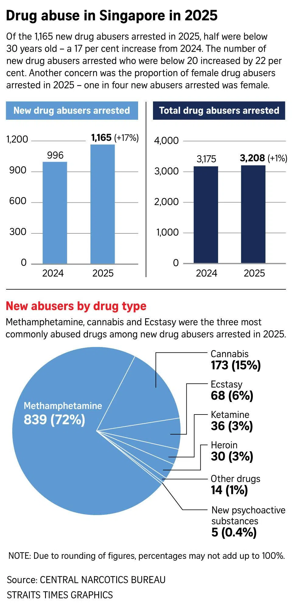 Figures released on Feb 10 by the Central Narcotics Bureau (CNB) showed that of the 1,165 new drug abusers they arrested in 2025, half were below the age of 30. This was a 17 per cent increase from 2024.