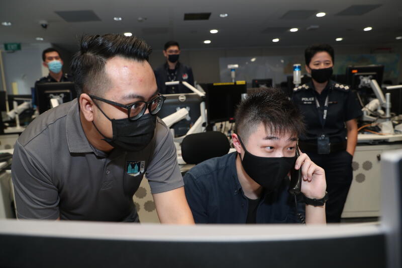 ST reporter David Sun answering a simulated 999 call as civilian officer Mohamad Suhaimi Bin Ami (left) looks on.