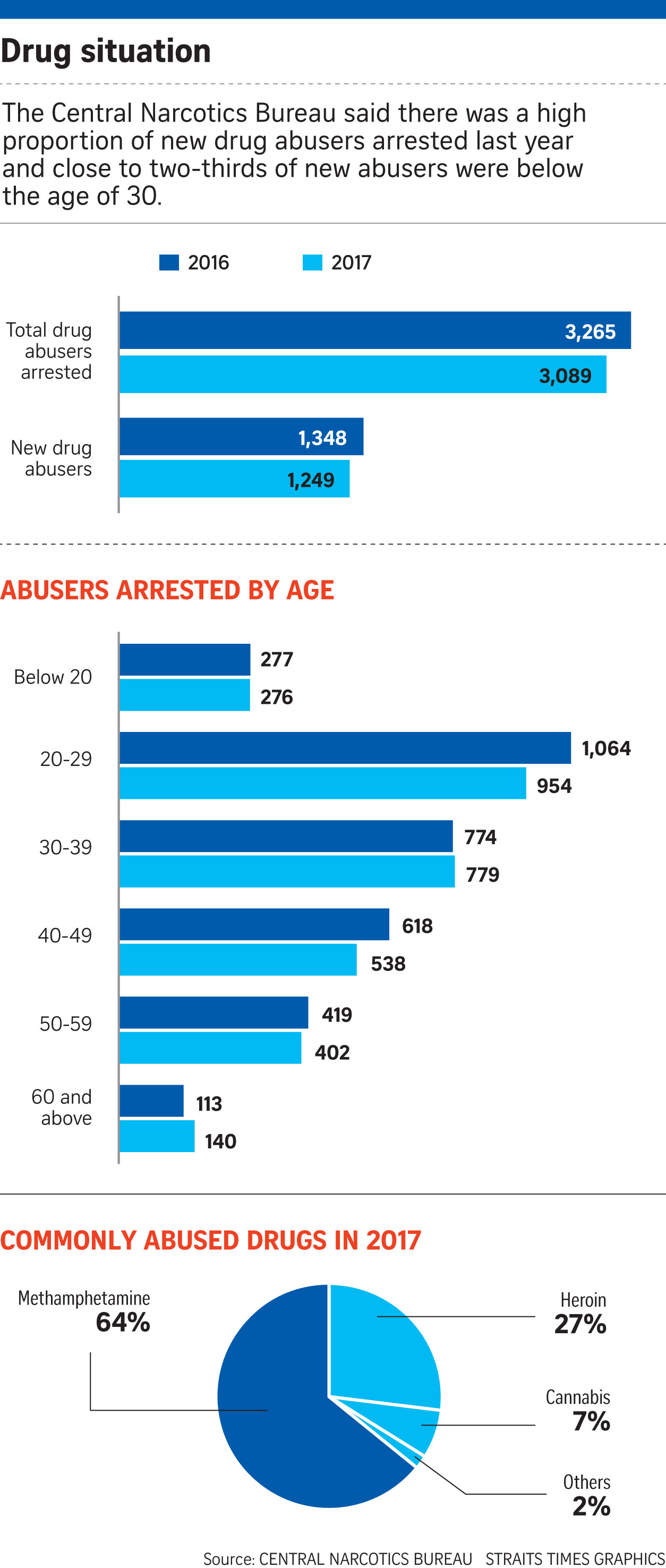 While the number of drug abusers arrested fell from 3,265 in 2016 to 3,089 last year, about 40 per cent of them were new abusers.