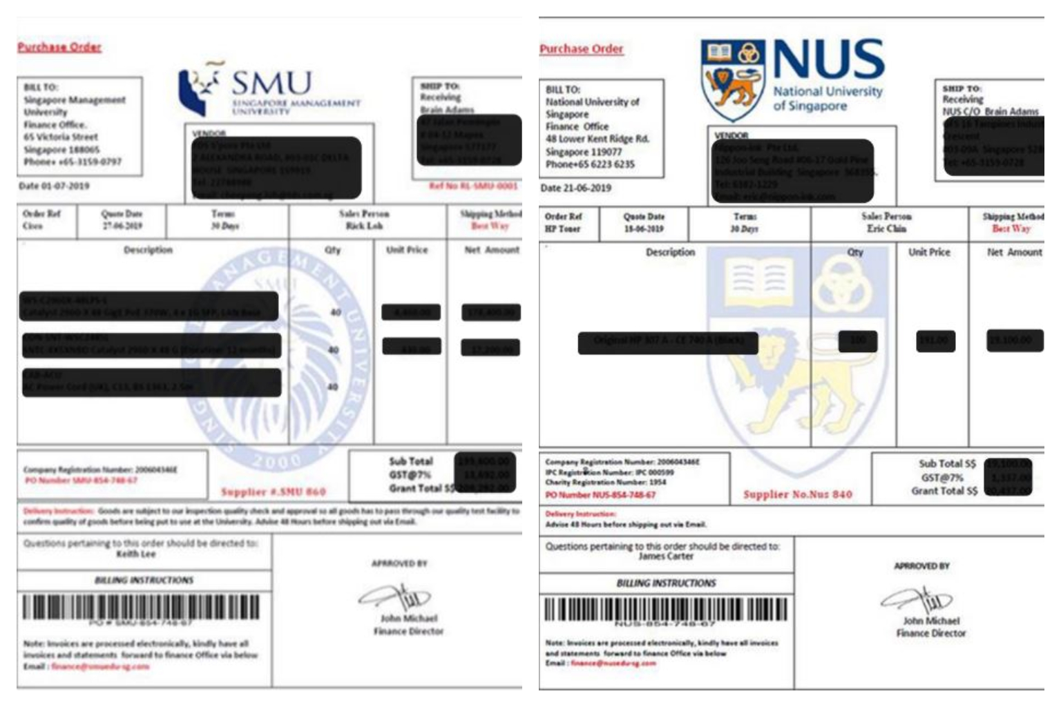 Samples of the false purchase orders that were sent by the scammer while posing as a procurement officer for SMU and NUS.