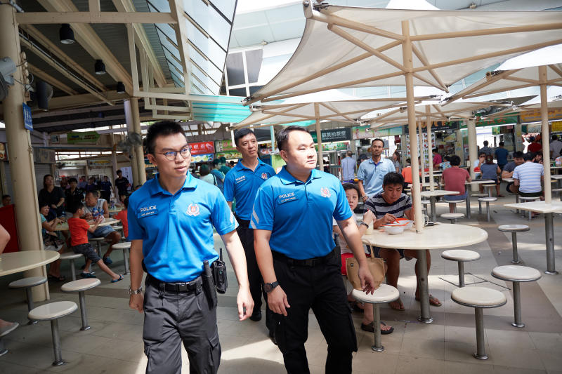 The first batch of Voluntary Special Constabulary (Community) officers patrolling Serangoon Garden Market and Food Centre on May 12, 2018.
