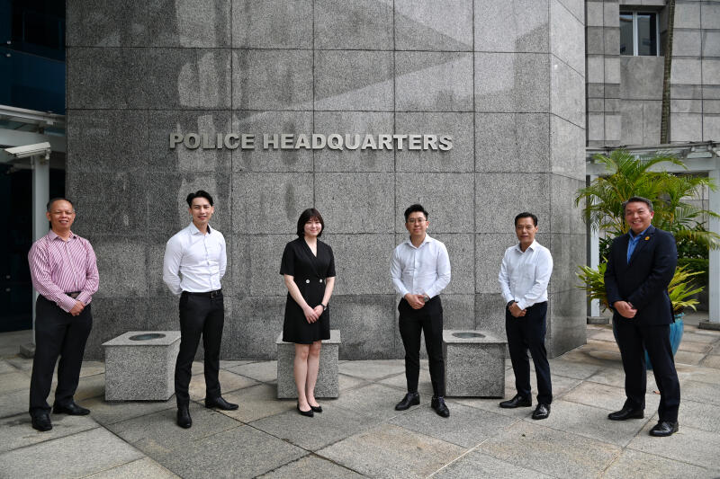 The award recipients include (from left) Mr Au Him Leong of Card Security Group of Singapore, Mr Elvin Lim of DBS, Ms Sara Lee of Jurong Point OCBC branch, Mr Leong Wen Xian of Jurong Point OCBC branch, Mr Joshua Wee of Hougang MRT Station UOB branch and Mr Christopher Ong of DHL Express Singapore.
