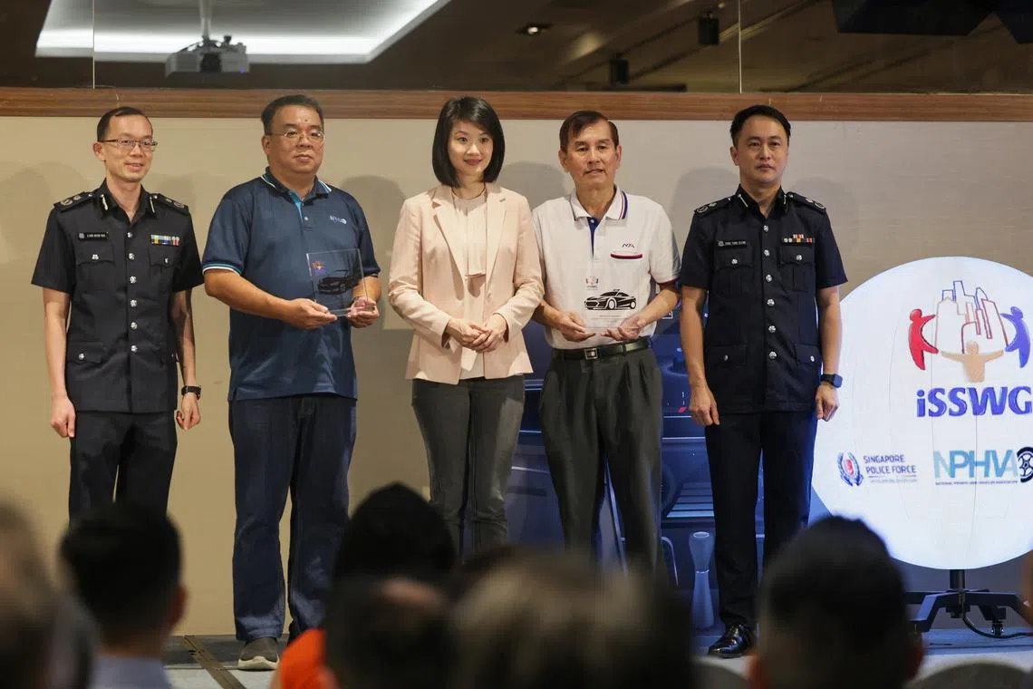 (From left) Deputy Commissioner of Police Lian Ghim Hua, NPHVA general secretary Joseph Goh, Minister of State for Home Affairs Sun Xueling, NTA president Raymond Ong and Assistant Commissioner of Police Shng Yunn Chinn at the launch of the Point-To-Point Transport iSSWG.