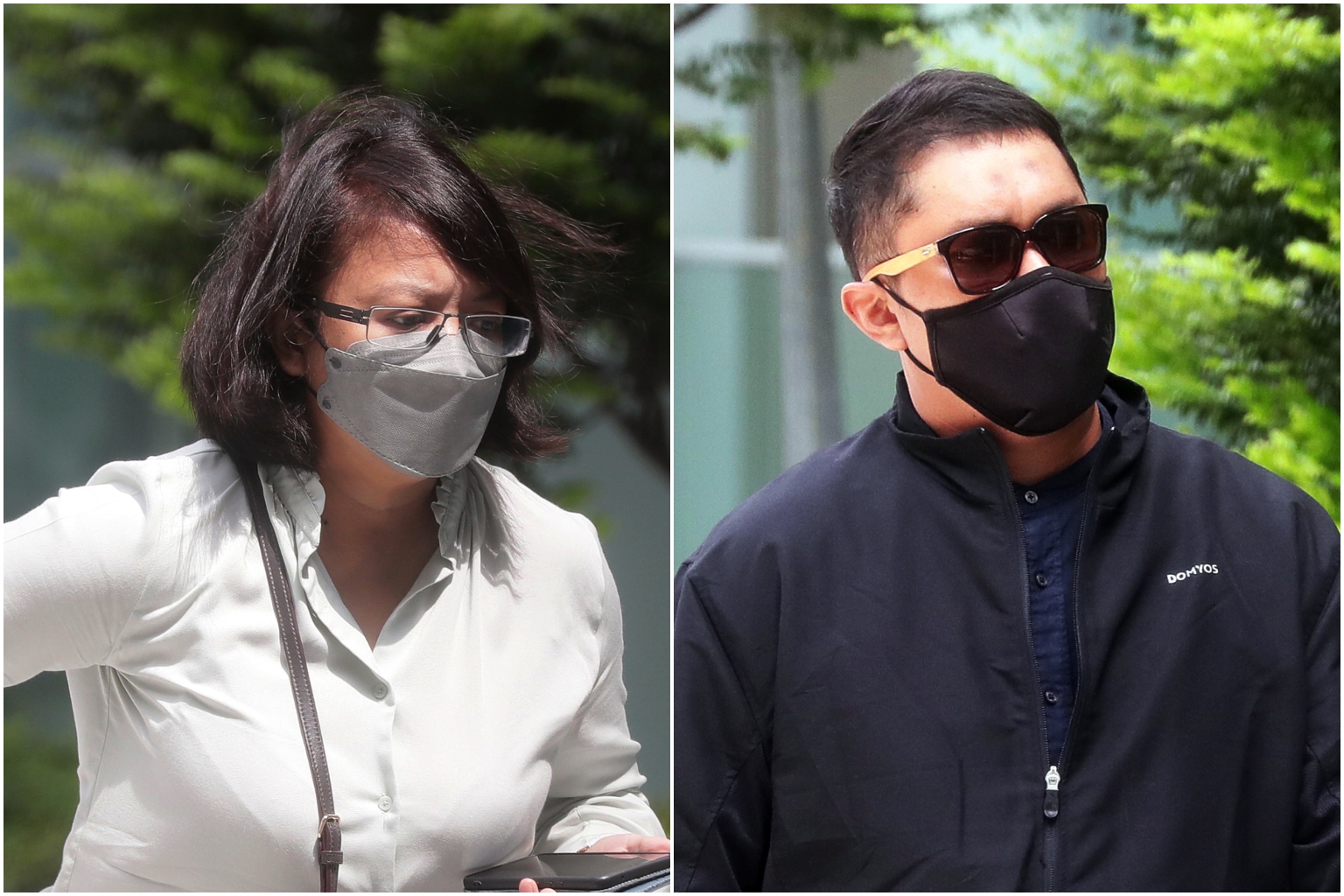 Noorain Jubli (left) at the State Courts in December 2021. She had leaked circuit breaker details to her husband (right).