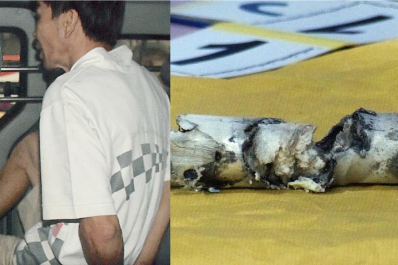 Curious, he pressed the button but nothing happened. Pointing the object towards the hawker centre, Aw pulled the string and pin while pressing the button. Immediately, there was a lot of smoke and a whizzing sound. There was no fire. He was alarmed and immediately went back into the shop.