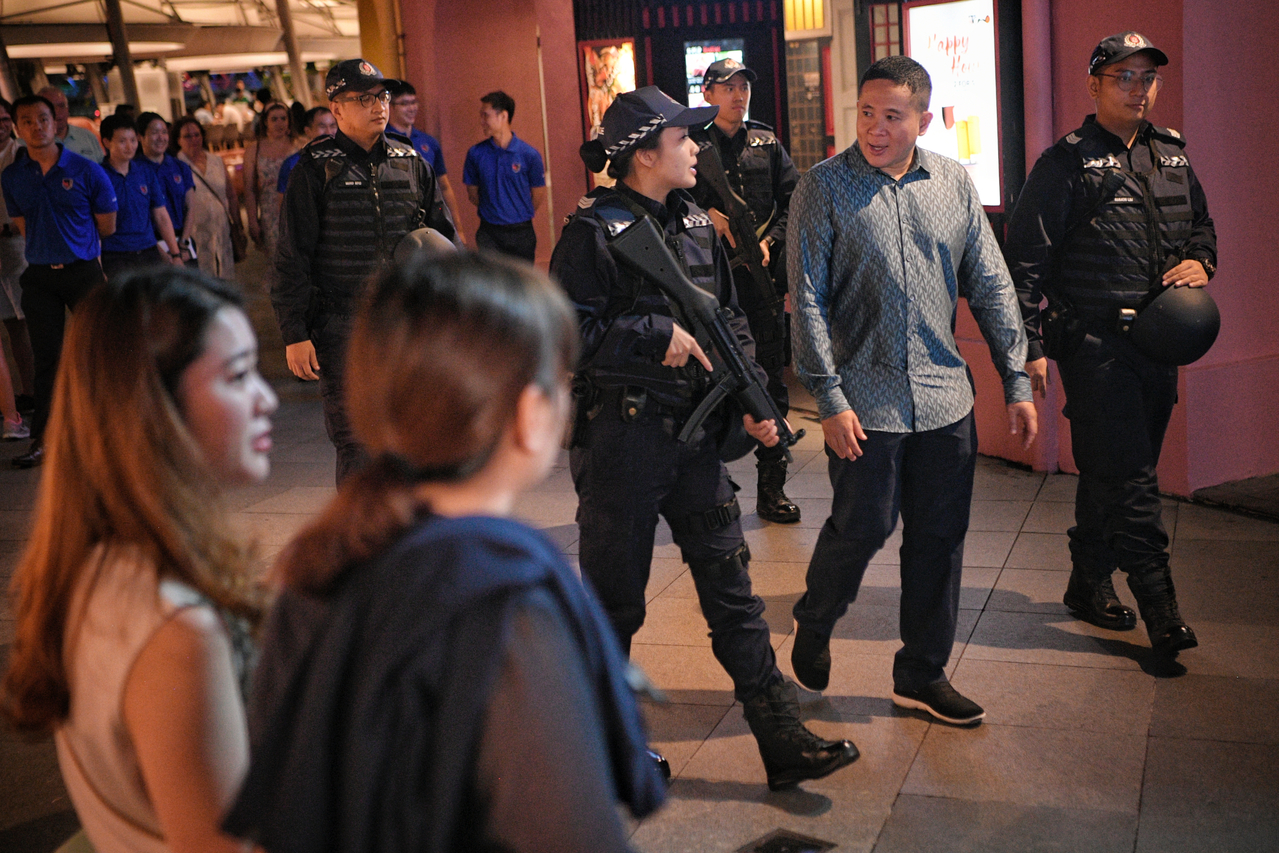 Senior Parliamentary Secretary of Home Affairs Amrin Amin with the In-Situ Reaction Team on a patrol of the Clarke Quay area on Dec 27, 2019.