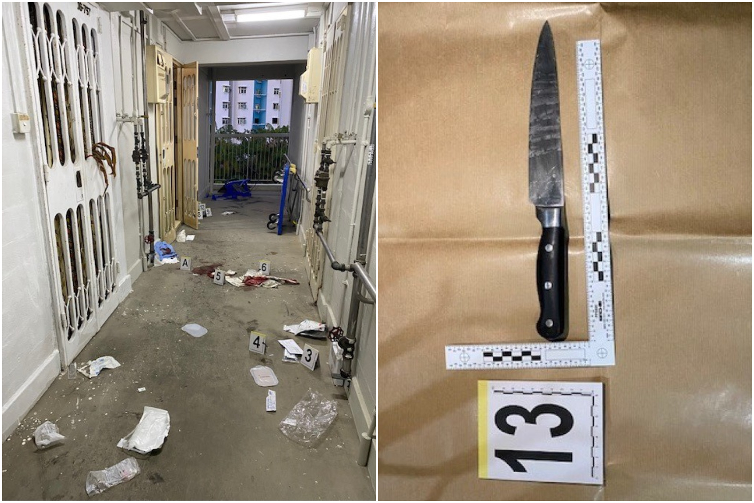 <p>Bloodstains on the floor and broken chairs seen outside the sixth-floor unit at Block 33 Bendemeer Road on March 23, 2022. Ng Eng Kui, a drug offender, had confronted police officers outside the unit of the Housing Board.</p>