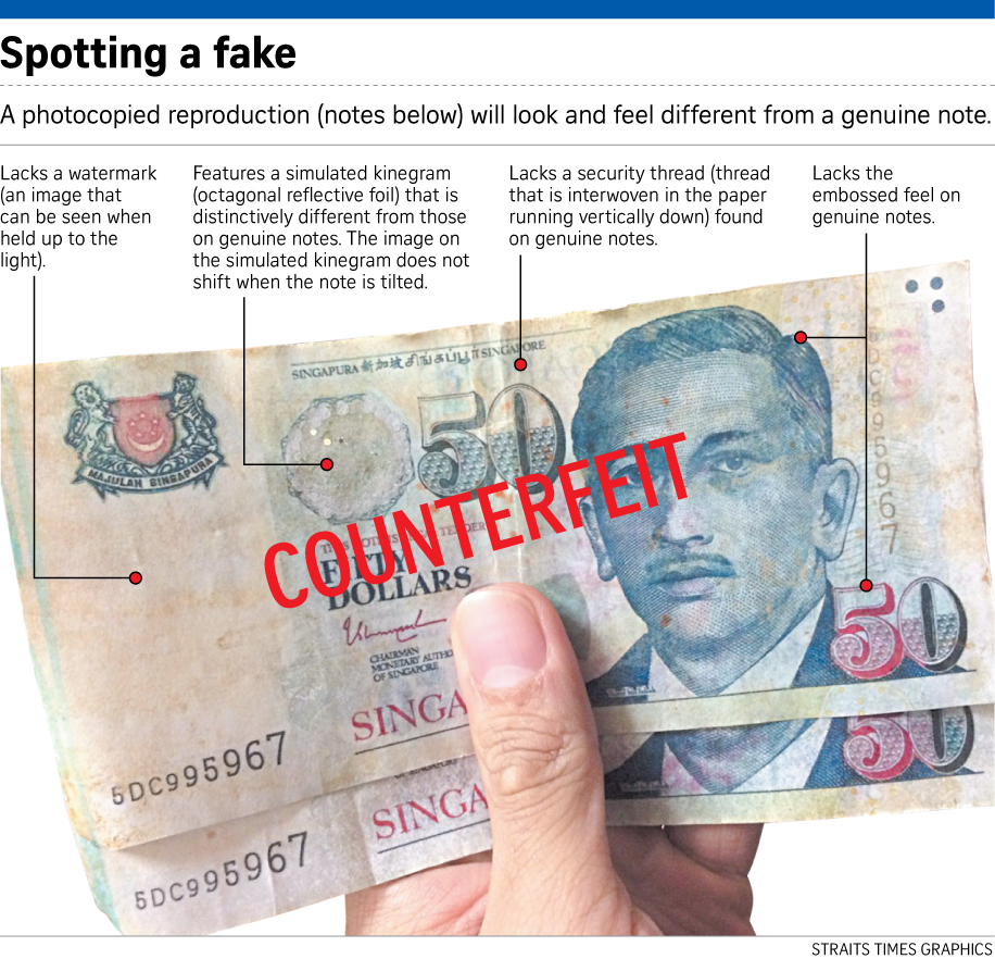 The police added that some of the fake notes have a simulated kinegram - an octagonal reflective foil - which is distinctively different from those on genuine notes.