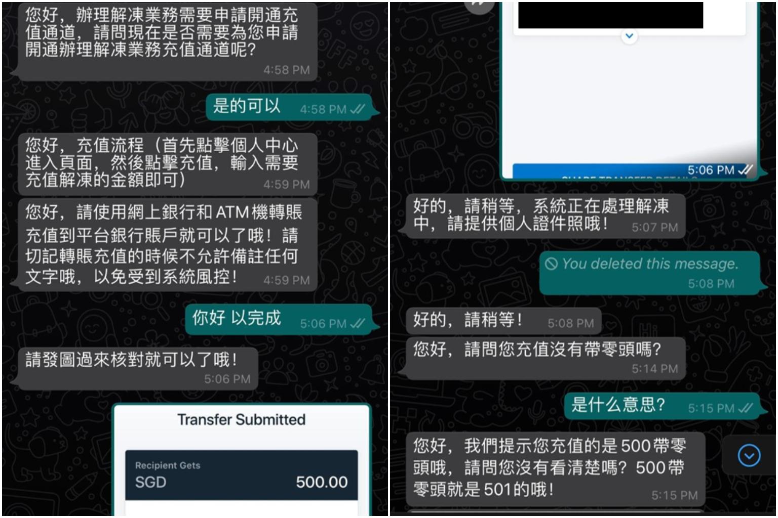 Screenshots from a victim showed scammers telling him to transfer $500 in order to unfreeze the $500 paid to his account