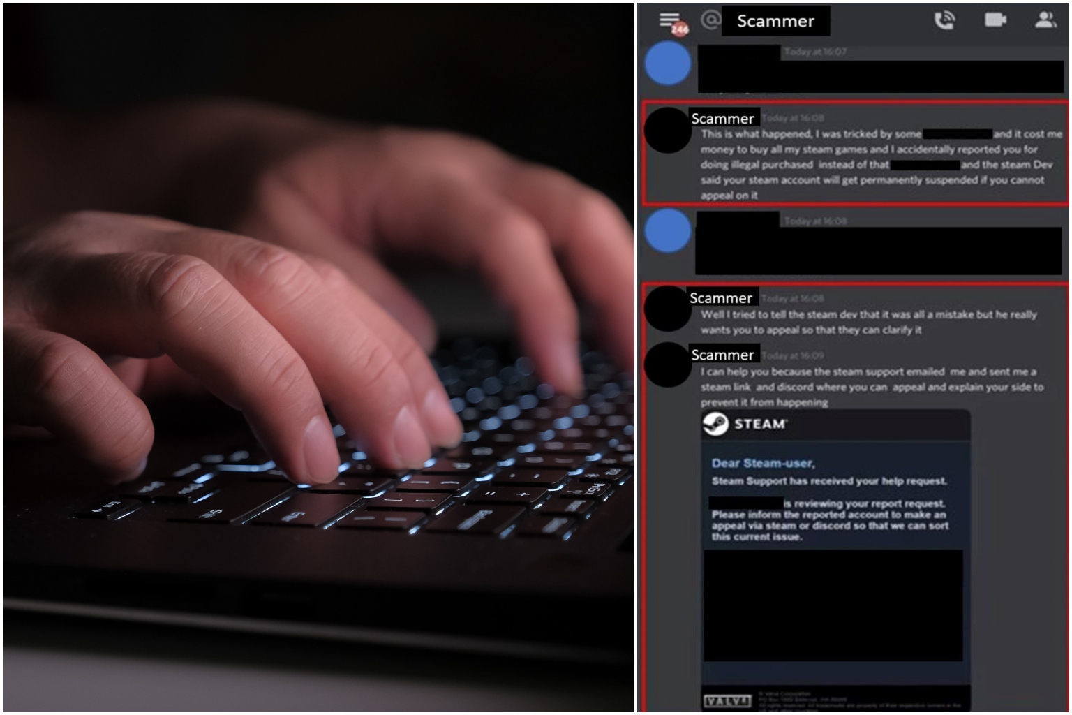 "Scammers would approach the victims through compromised Steam accounts and would claim that they had accidentally reported the victims' Steam accounts while trying to report another Steam user.