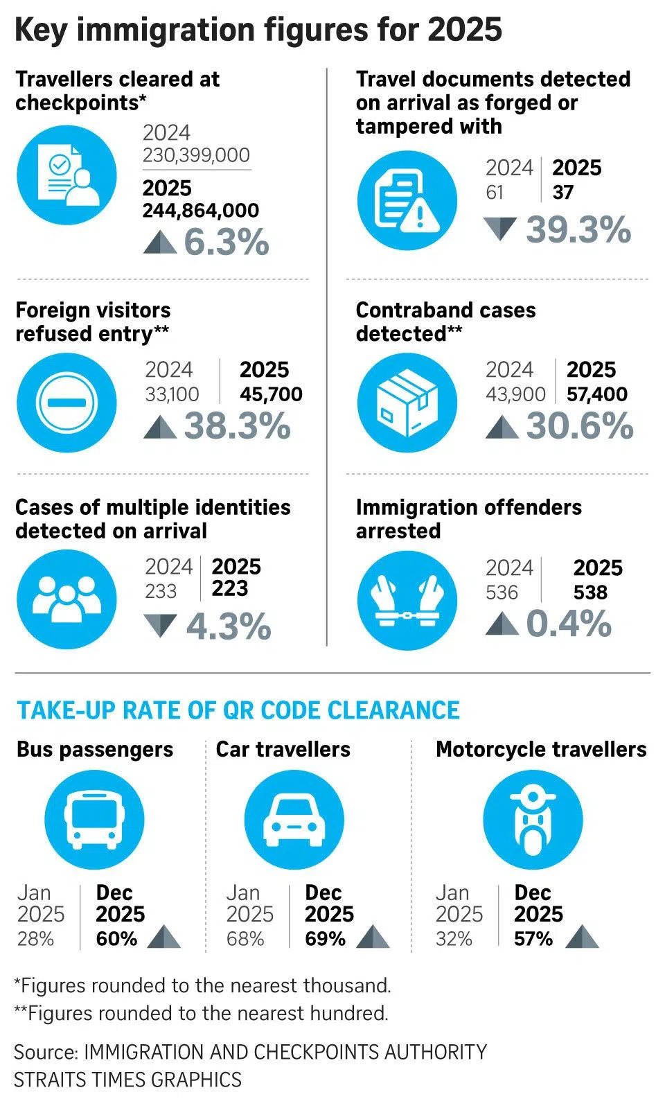 Foreigners denied entry into Singapore jumped 38 per cent in 2025 to 45,700 cases.