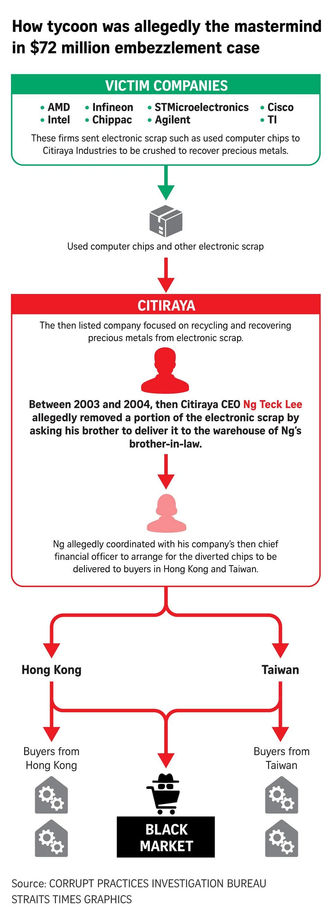 Ng Teck Lee, who was the CEO of then listed recycling firm Citiraya Industries, and his wife Thor Chwee Hwa being handed over to CPIB officers on Dec 3.