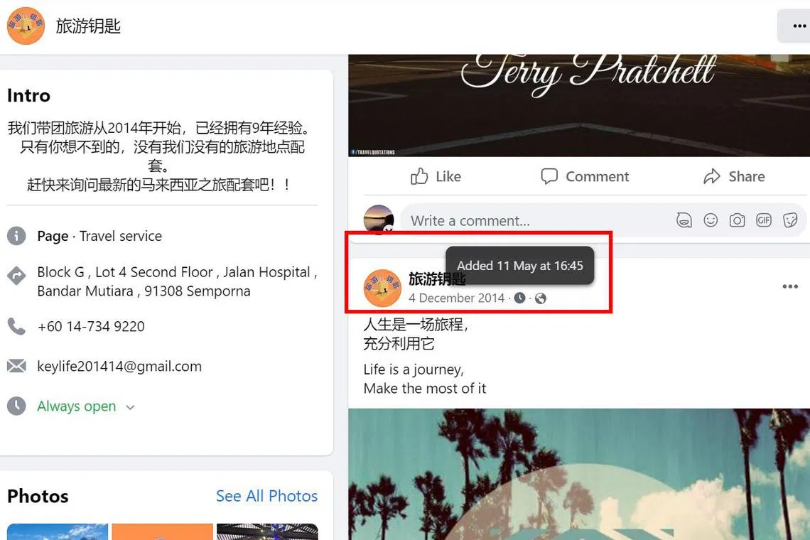 Although Travel Key claimed to have started business in 2014, checks showed their Facebook posts were all added from May 2023 and backdated several years.