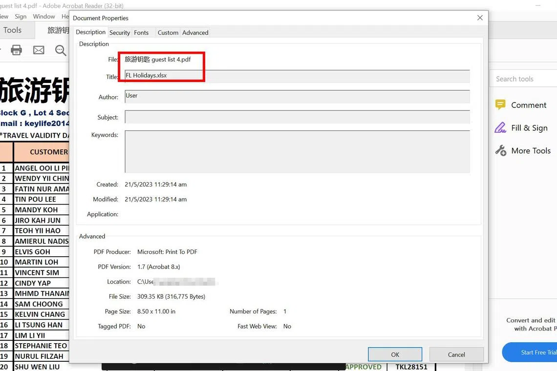 Checks by ST show that the original file title of Travel Key's guest list is "FL Holidays.xlsx".