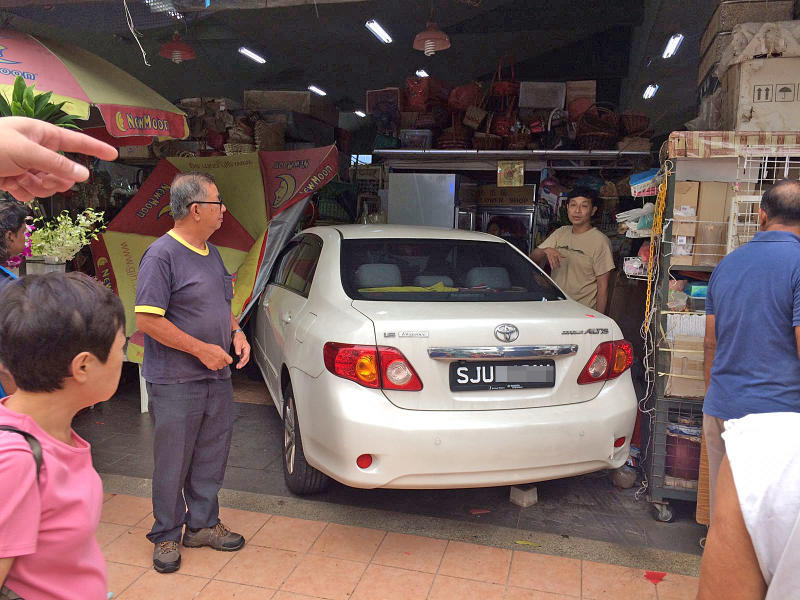 He switched gears to drive forward but failed to maintain control over the vehicle, causing it to surge forward. The car mounted a kerb and crashed head-on into a florist's stall in Marine Terrace Market, and struck three people who were in the stall.
