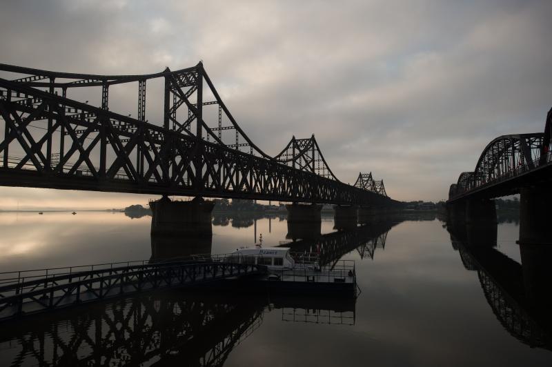 The Friendship bridge connecting the North Korean town of Sinuiju and the Chinese border city of Dandong. Trucks ply the bridge to bring goods from China into North Korea.
