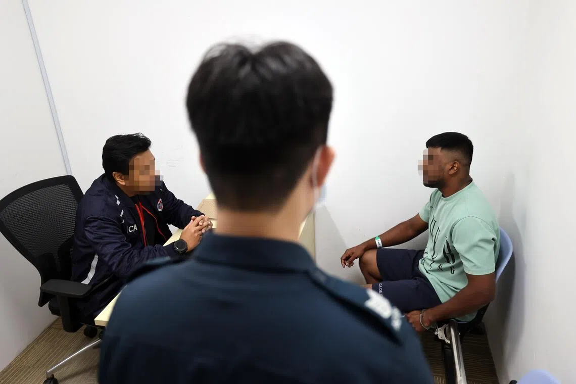 An investigation officer from the Immigration and Checkpoints Authority’s enforcement division speaking to the suspected overstayer at an interview room in the ICA building.