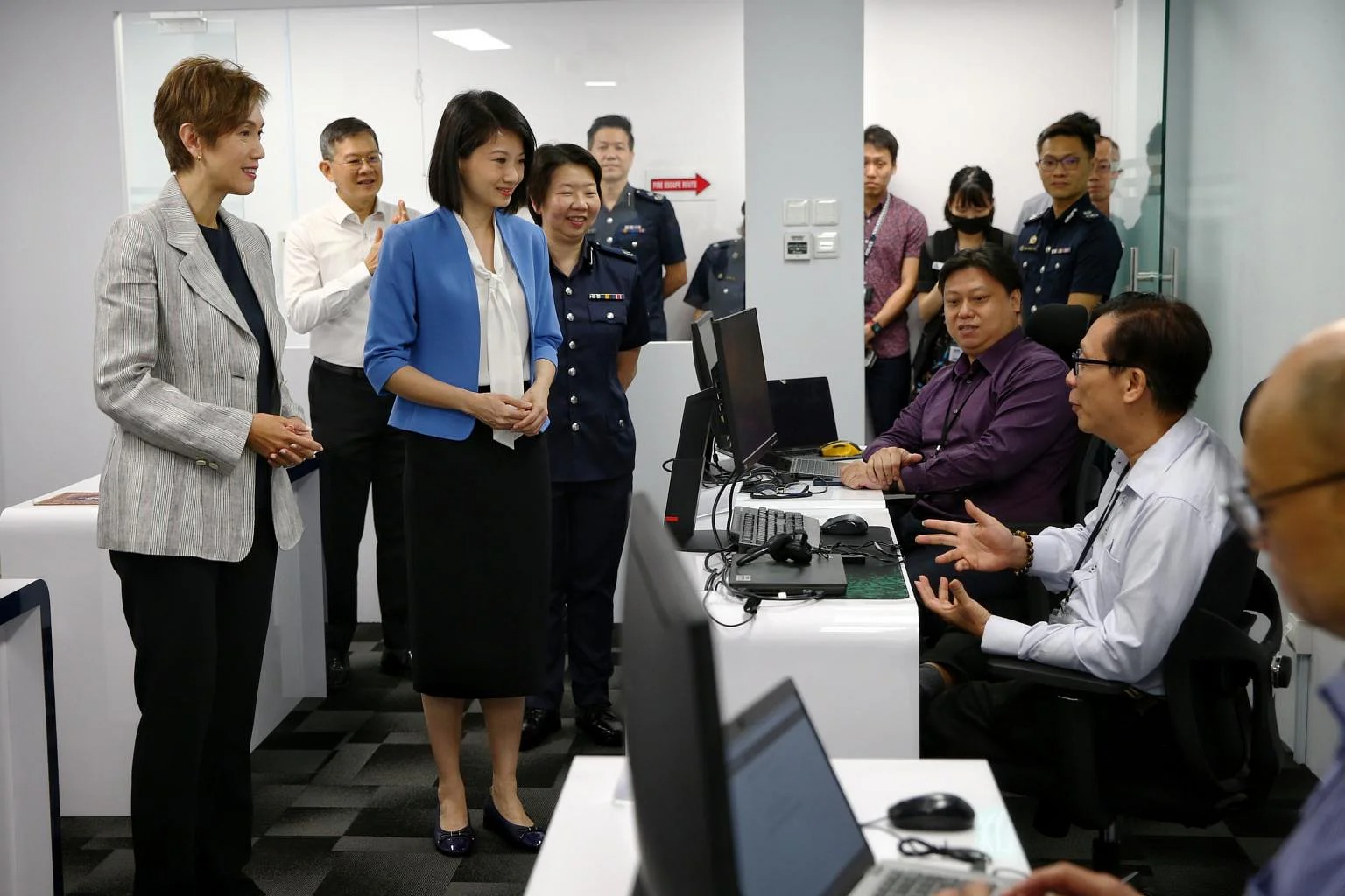Minister for Communications and Information Josephine Teo (left) and Minister of State for Home Affairs Sun Xueling (second from left) speak to representatives of various banks based in the Anti-Scam Command office.