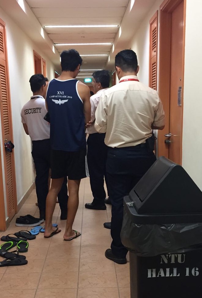 Students and campus security gathered in the hallway after a peeping tom was caught filming a resident at a student dormitory at the Nanyang Technological University on Oct 13, 2016.