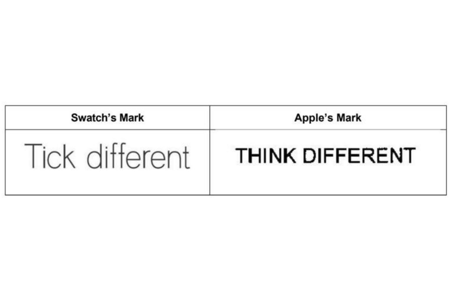 Apple's "Think Different" mark was used in its successful Emmy-award winning advertising campaign which ran for five years from 1997. Swatch's "Tick Different" mark, which has not been used, referenced its longstanding association with timepieces.