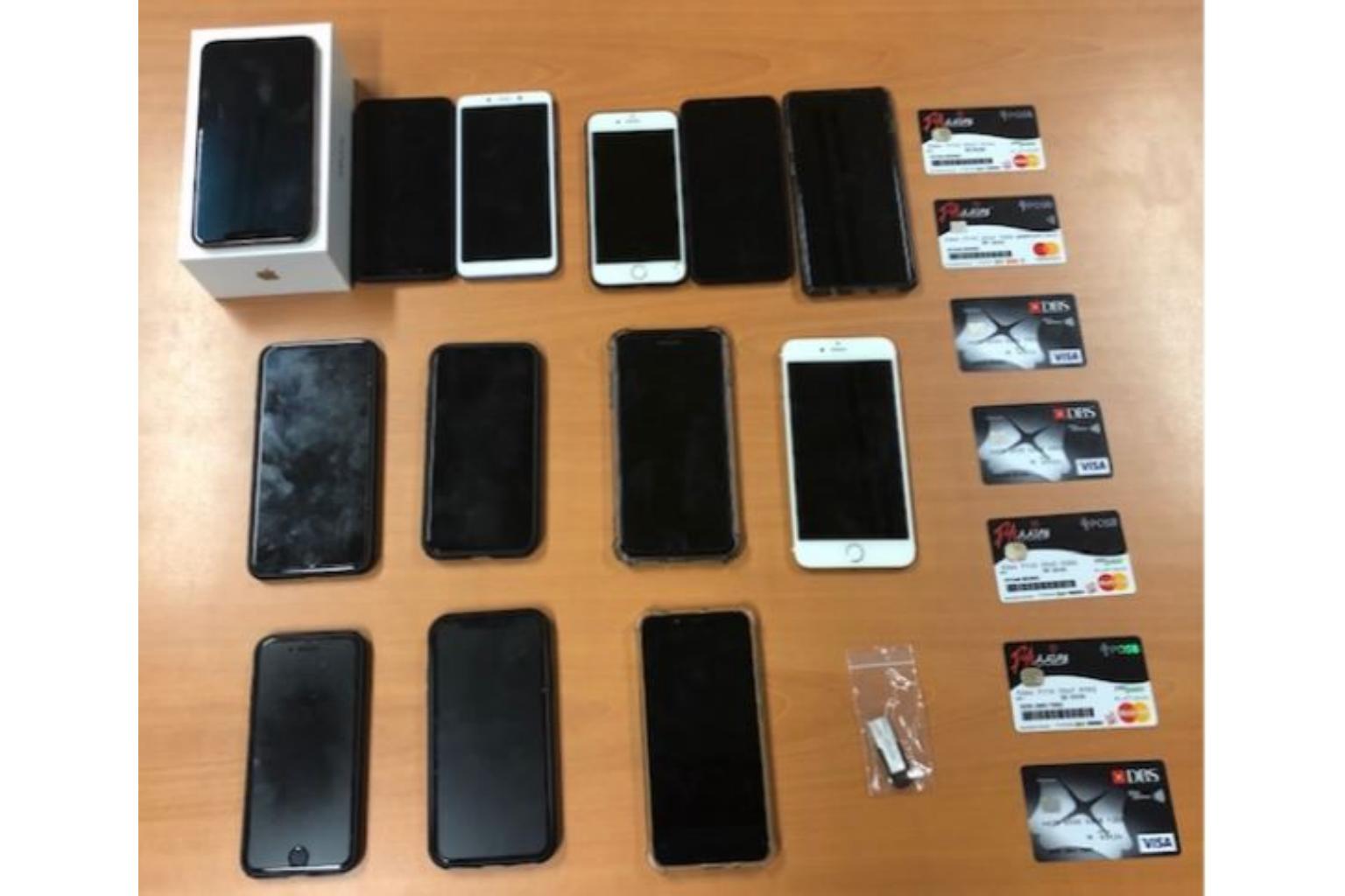 Mobile phones, debit cards and a thumb drive were seized as case exhibits.