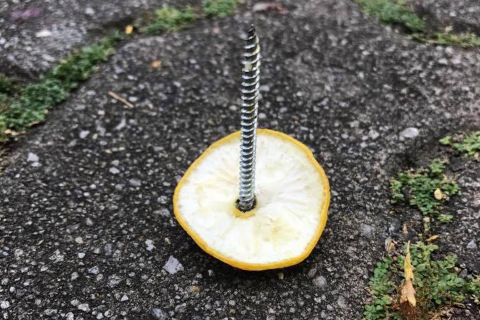 The resident said there were eight to 10 screws inserted into lemon peels and lying with the spikes facing up.