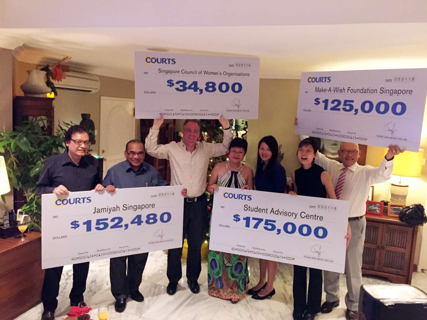 Electronics and furniture retailer Courts, and families and friends of its staff, raised more than $487,000 for four charities last year. On Tuesday evening, Courts Singapore chief executive Terry O'Connor (centre, in white), presented cheques to representatives from the Student Advisory Centre, Make-A-Wish Foundation Singapore, Muslim welfare group Jamiyah Singapore and the Singapore Council of Women's Organisations.