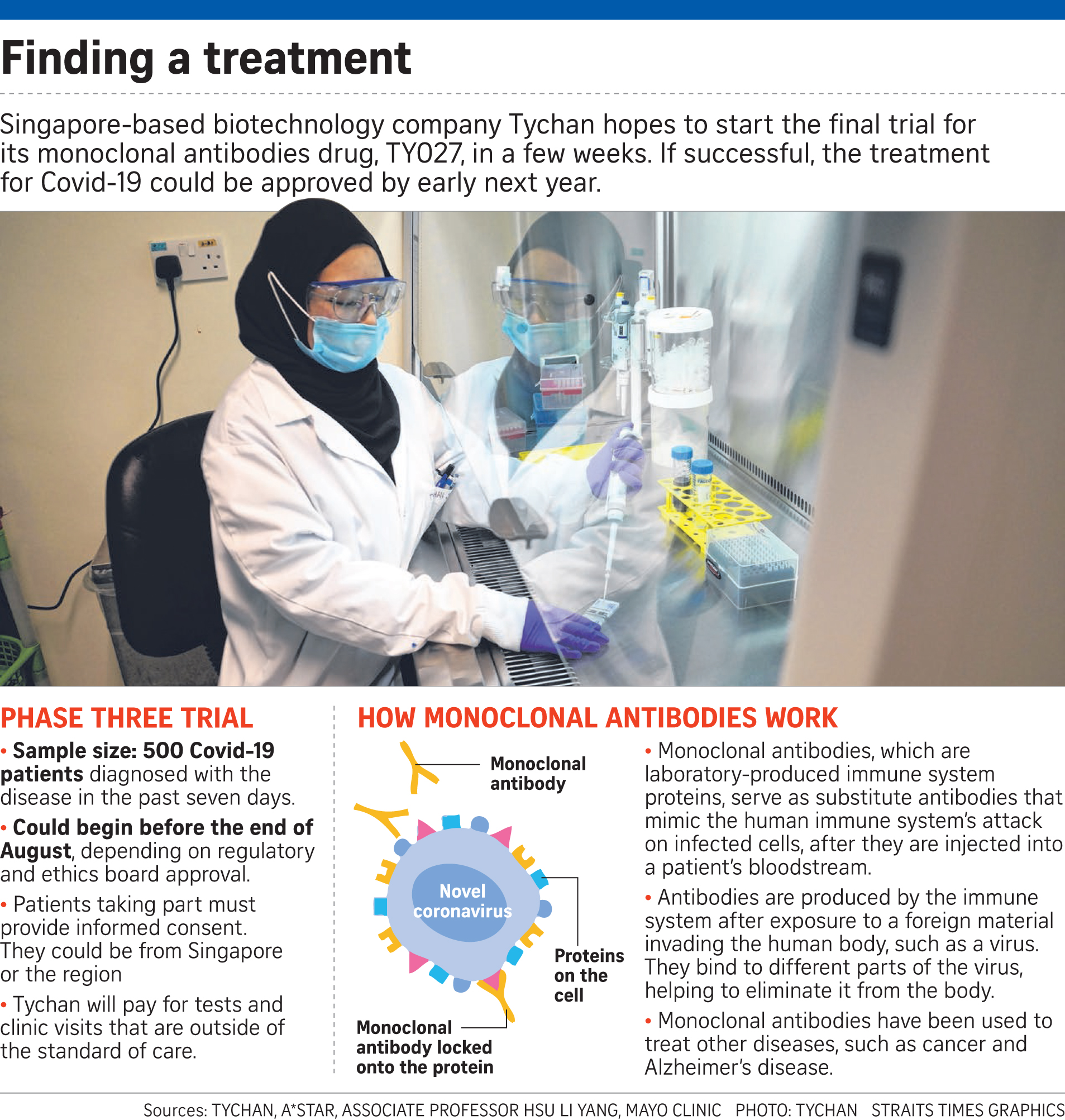 Developed by Singapore-based biotechnology company Tychan, the monoclonal antibody - or immune system protein - known as TY027 will be tested on 500 recently diagnosed Covid-19 patients.