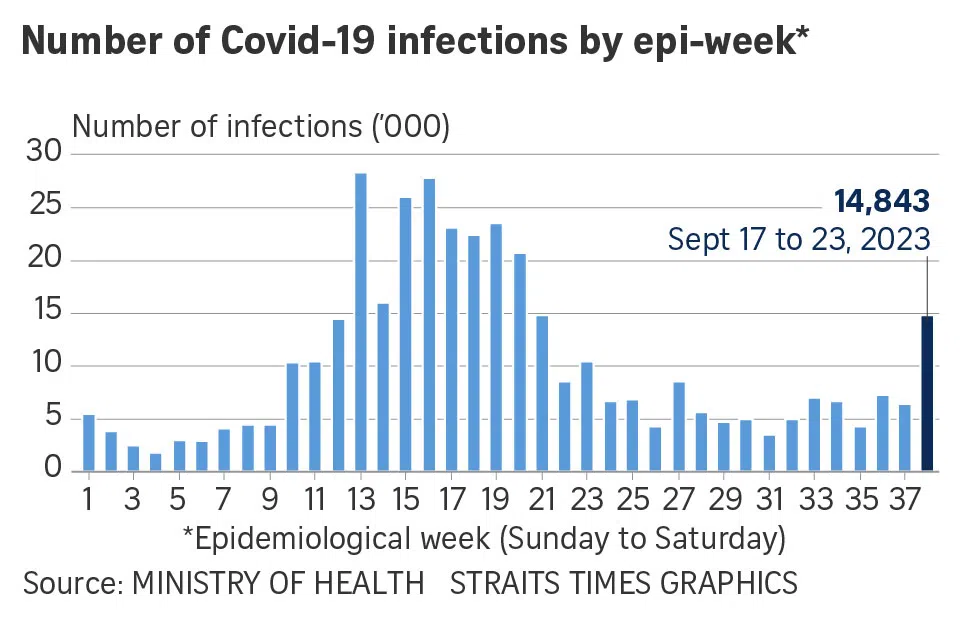 SINGAPORE – There was a spike in the number of Covid-19 infections here in the week of Sept 17 to 23. The 14,843 people diagnosed with the disease are more than double those in the previous week, when 6,401 cases were recorded.