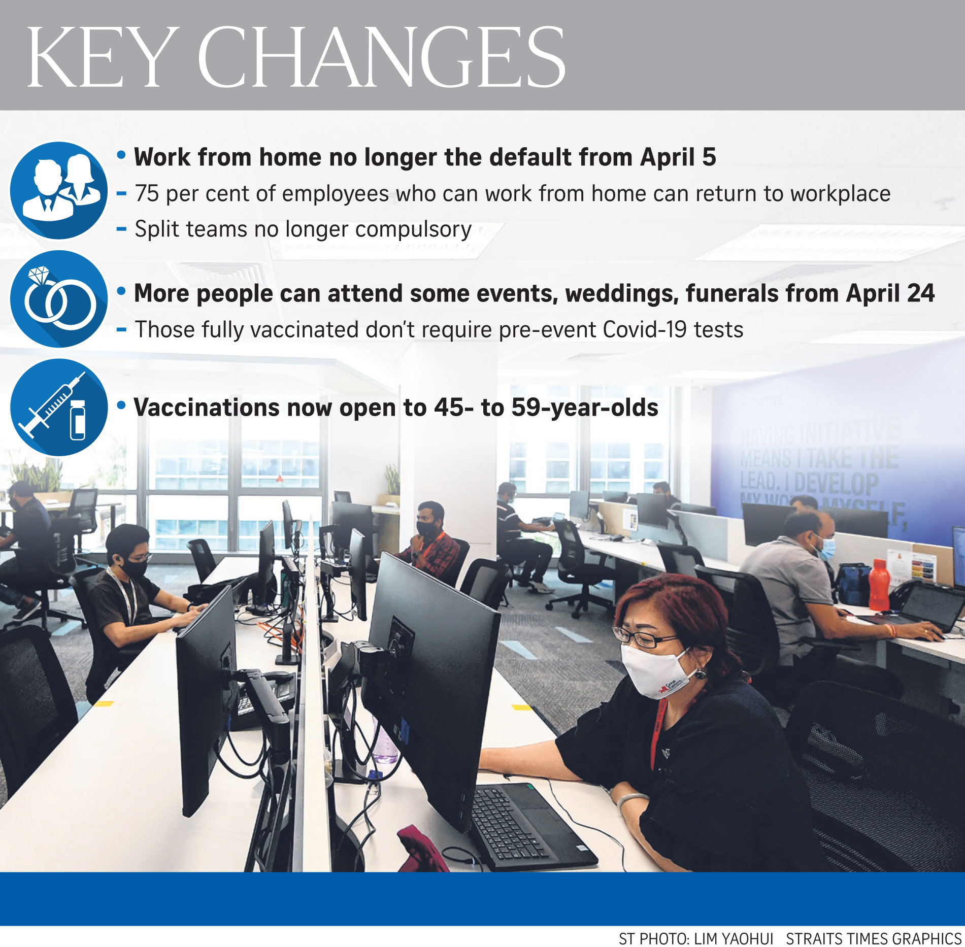 From April 5, up to 75 per cent of a firm's employees who are currently able to work from home will be able to return to the workplace at any one time, up from 50 per cent now, said Education Minister Lawrence Wong, who co-chairs the task force tackling Covid-19.