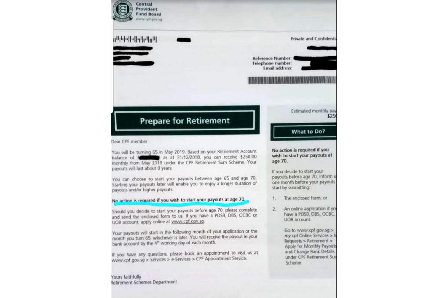 Responding to media queries, a CPF Board spokesman said the letter was sent to CPF members to inform them that they can start their monthly payouts by completing an application form with their bank account details or applying online.