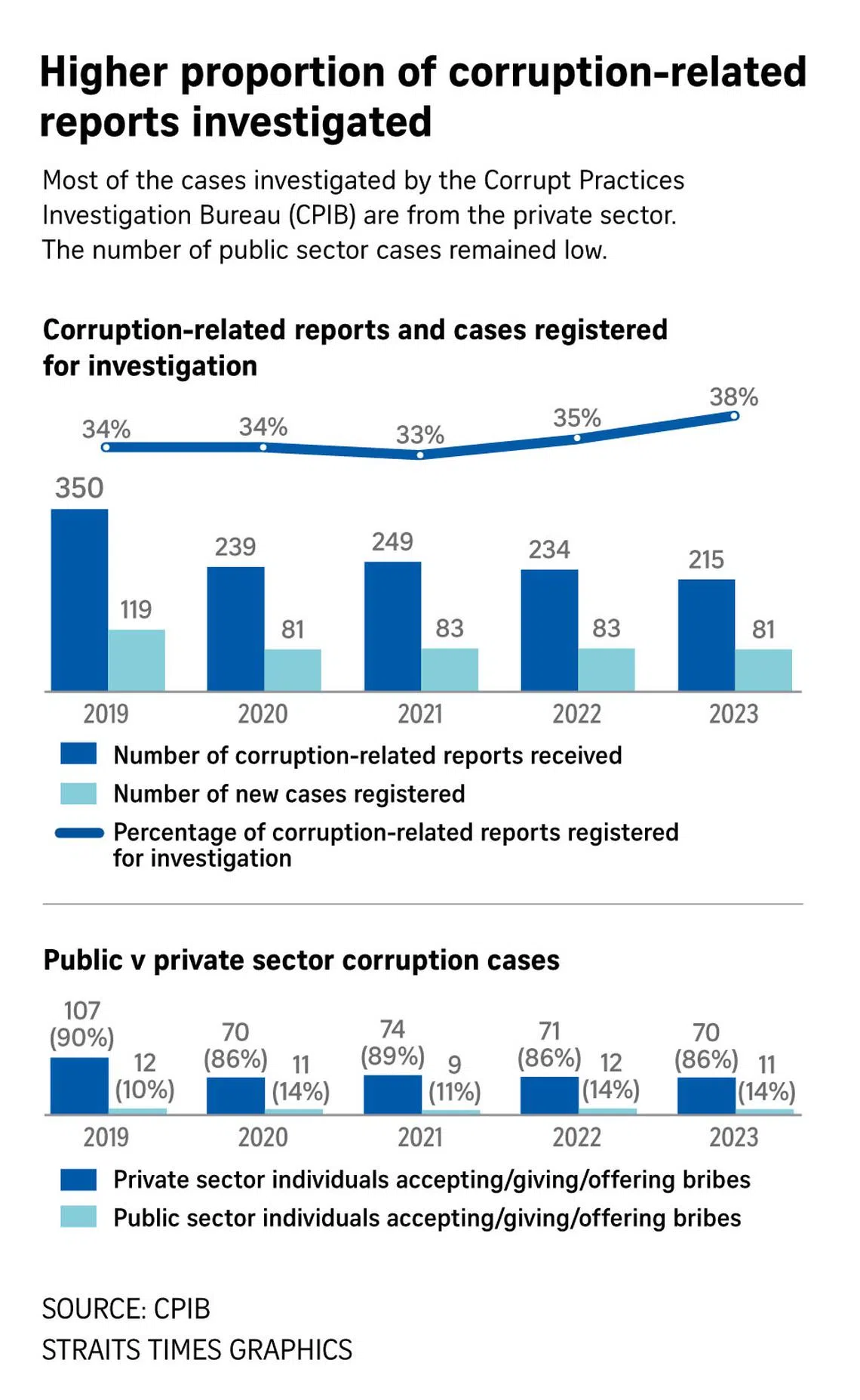 SINGAPORE - The Corrupt Practices Investigation Bureau (CPIB) received fewer reports in 2023 than in the previous year, but a higher proportion of the cases were subjected to investigation.