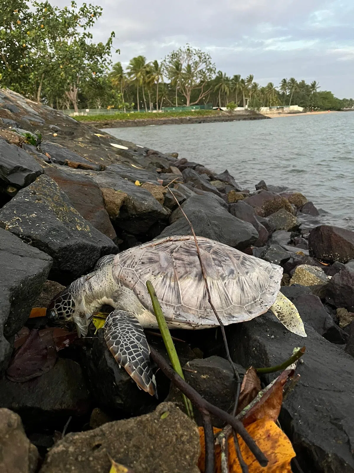 “When I saw it, I thought it might be alive, but stuck on the shore on the rocks and boulders,” he said. “I tried lifting it, and that’s when I realised it was already dead. The centre of the shell looked kind of cracked, and it was not very heavy. It felt like a lot of the insides were already drained out, and the turtle was decaying.”
