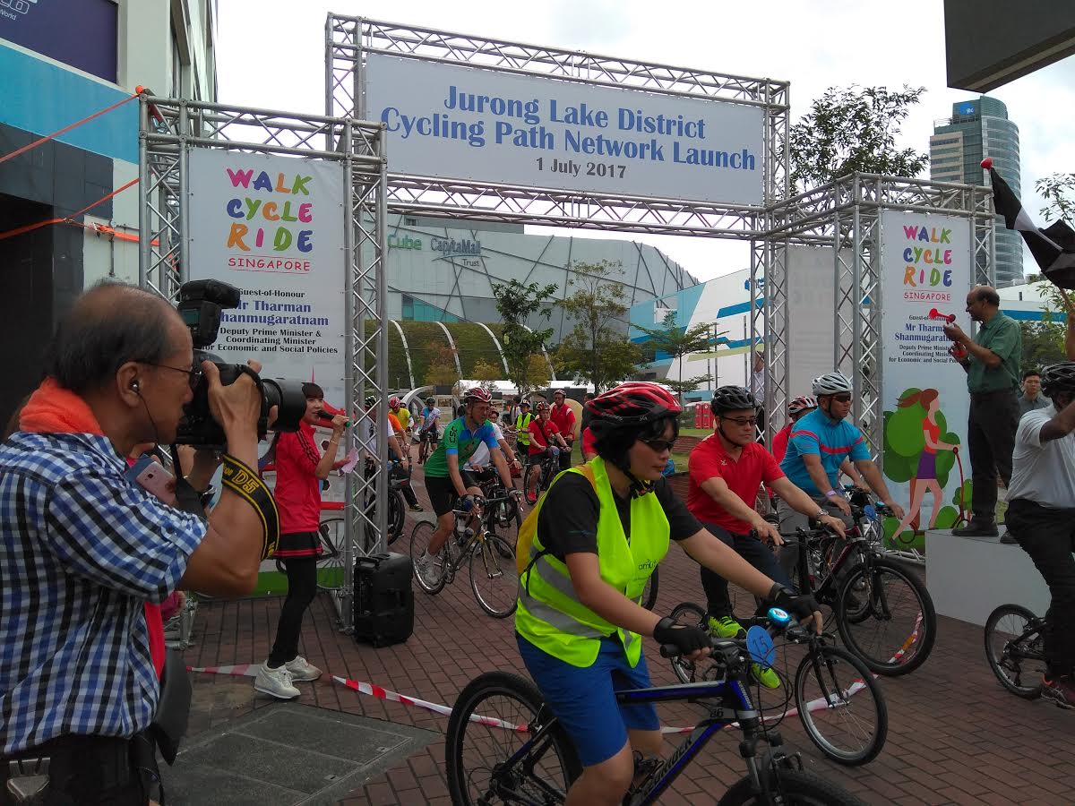 People cycling at the launch of the new cycling path network at Jurong Lake District.