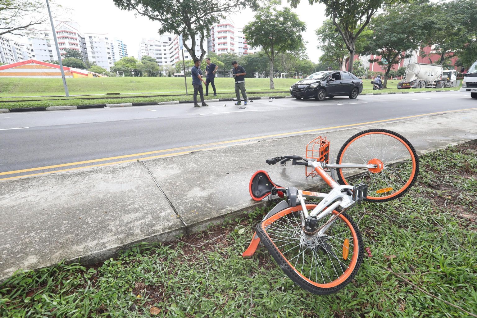 The 19-year-old female cyclist was taken unconscious to Ng Teng Fong General Hospital. A photo published in Lianhe Wanbao on Tuesday shows a mangled Mobike bicycle lying on the grass, while a car parked at the other side of the road is shown with dents in its front.
