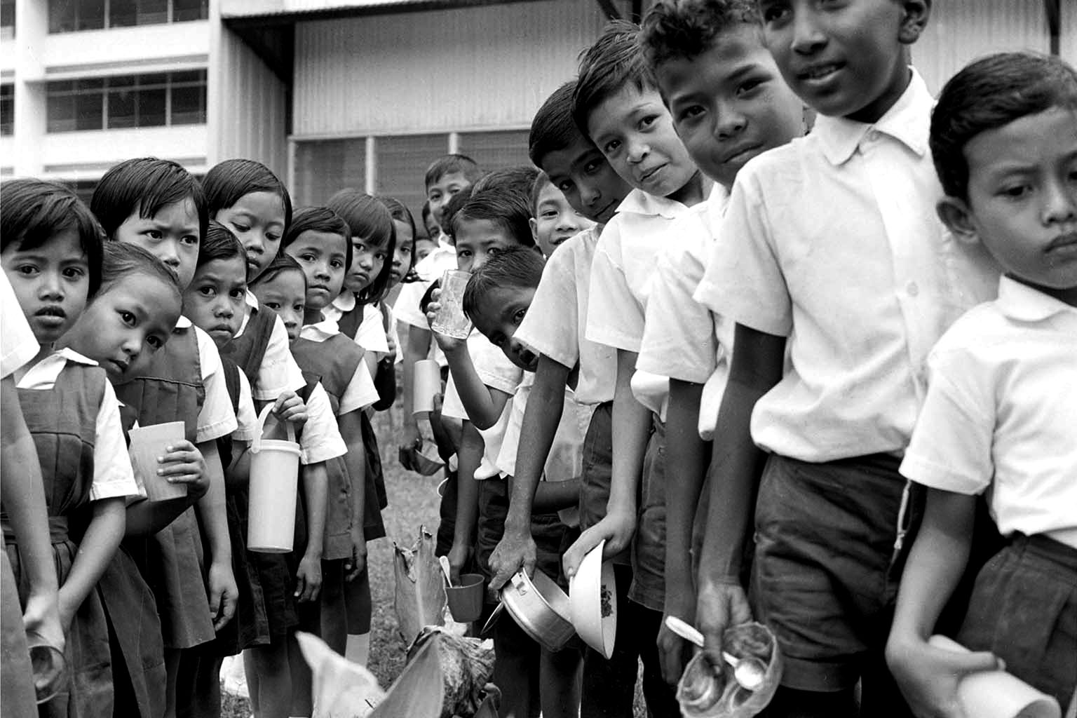 Pupils queuing up for free milk provided by their school in 1972. The school milk scheme was introduced in the 1950s and continued until the 1980s to improve children's nutritional intake.