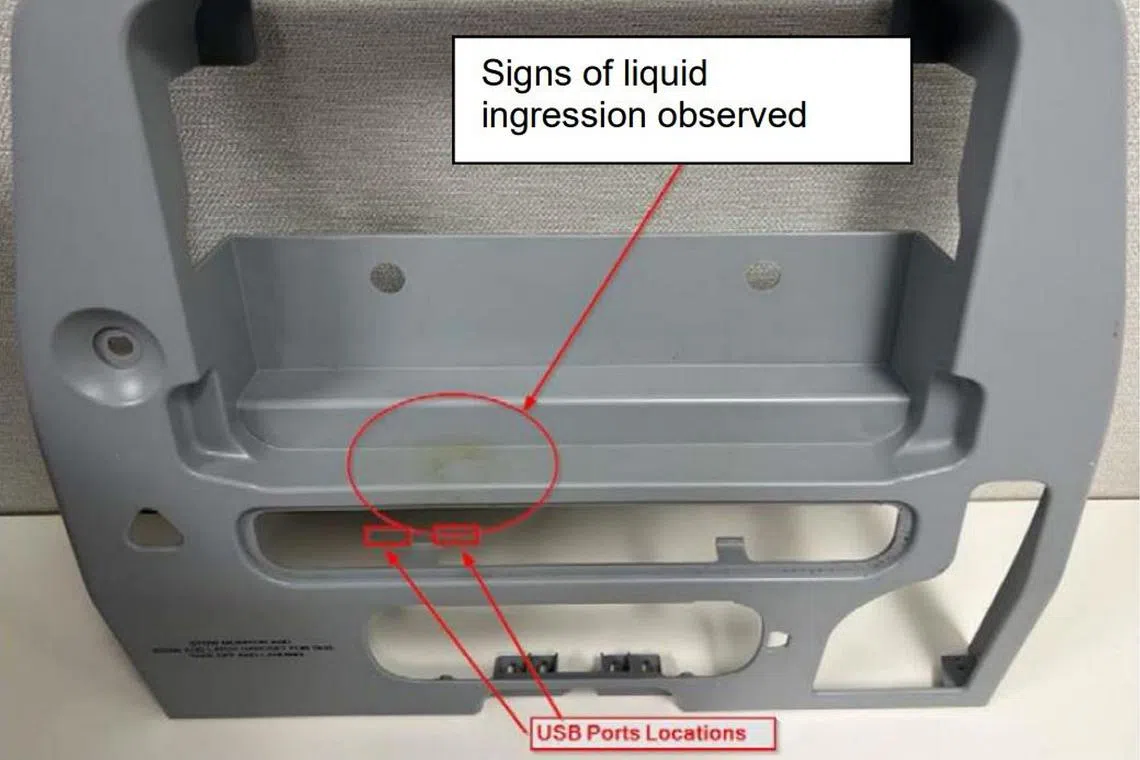 The liquid on the IFE frame was reportedly one of the factors leading to the unit getting damaged on March 27, 2023.