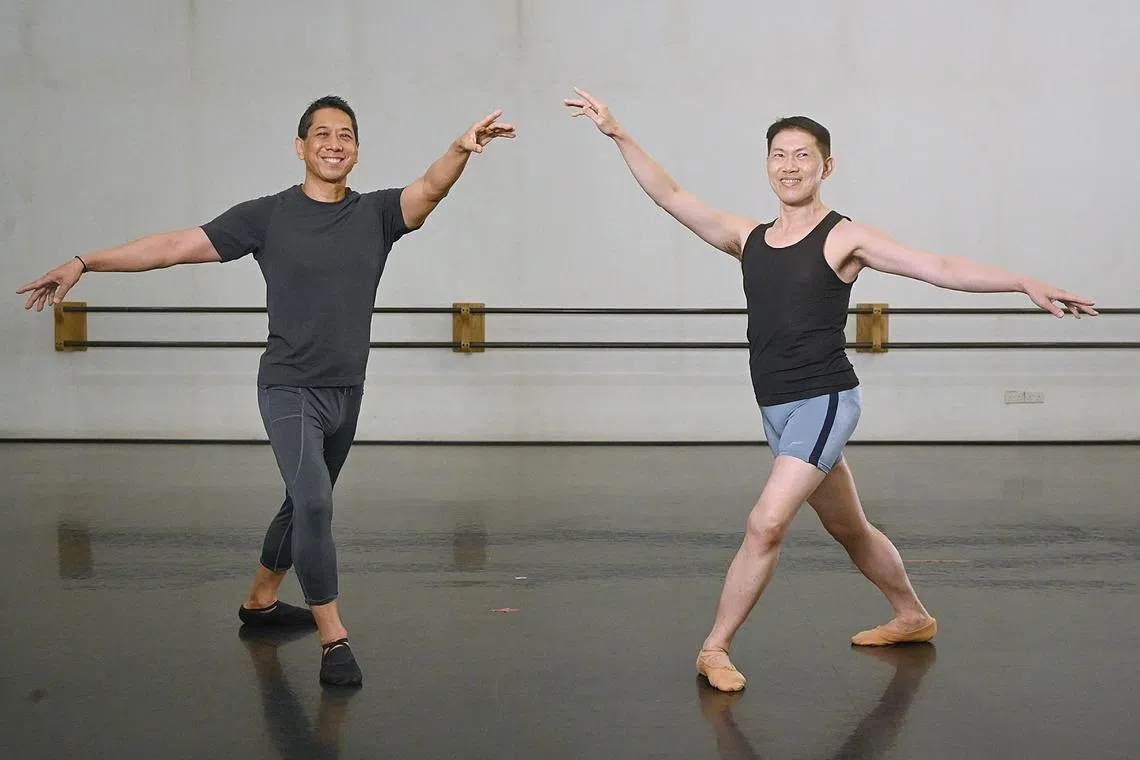 Mr Marcus Yeung (left) and Mr Michael Wong, who are in their 50s, take adult ballet classes at the Singapore Ballet.