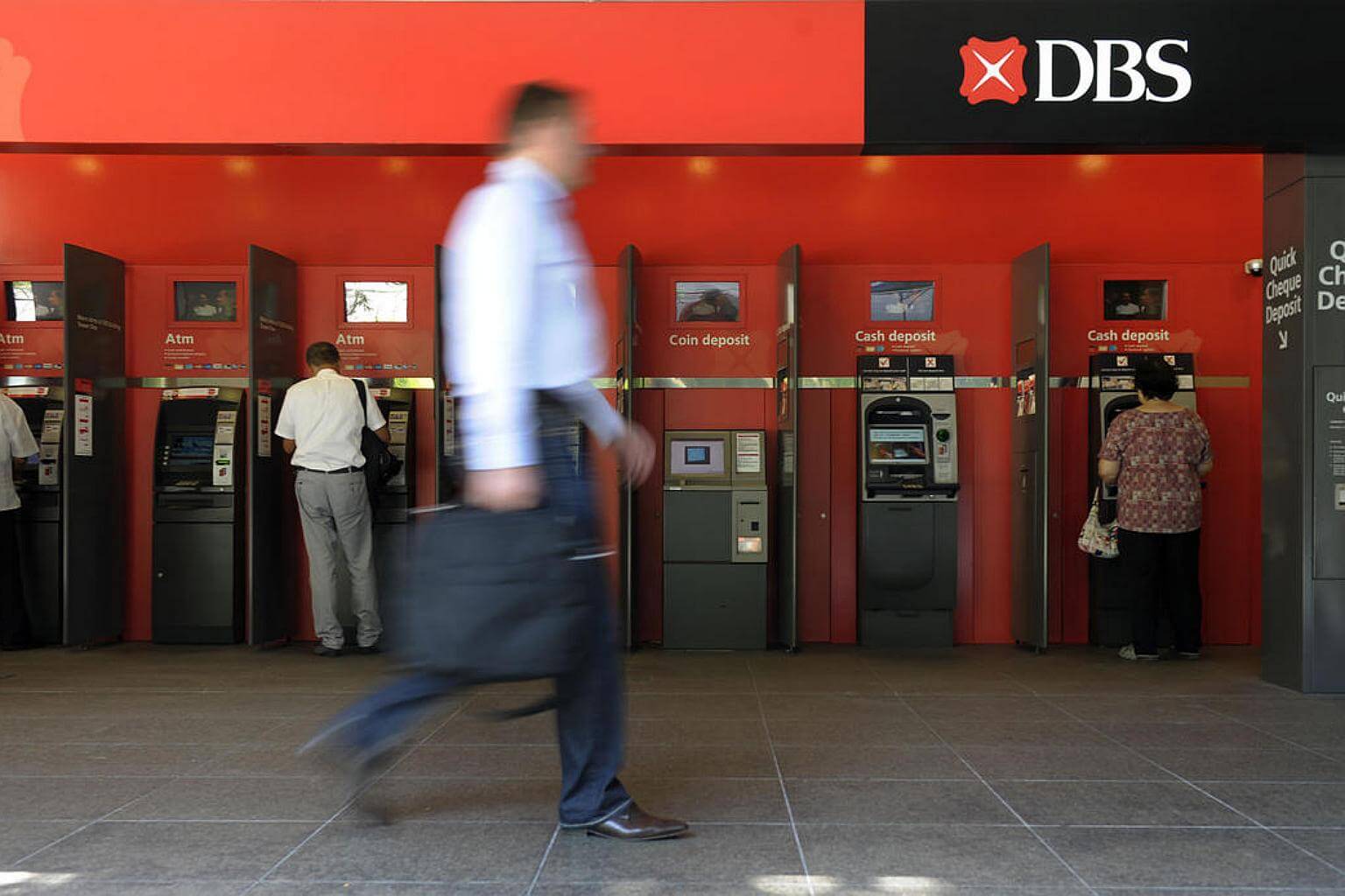 A person walks past a DBS atm at Shenton Way.