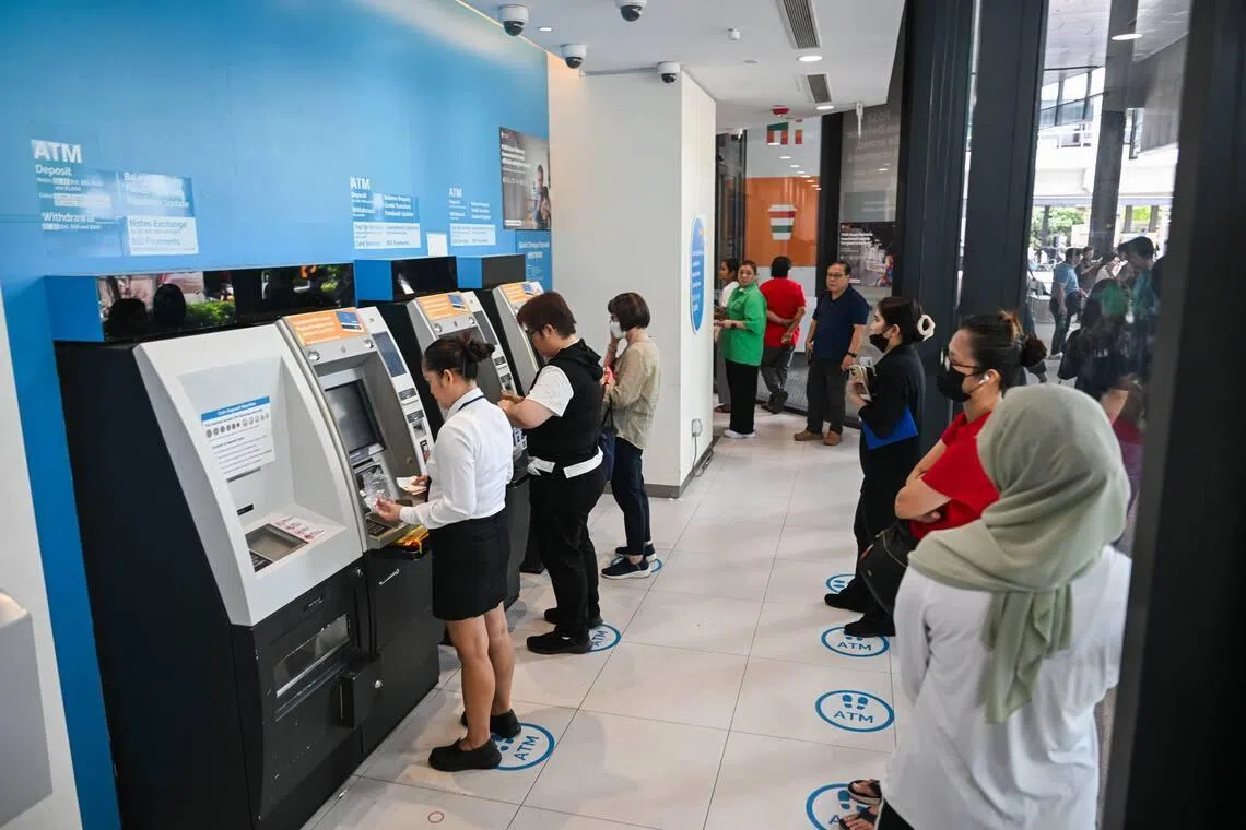 Customers queueing to use the ATMs at POSB’s Paya Lebar branch at around 1.50pm on March 19.