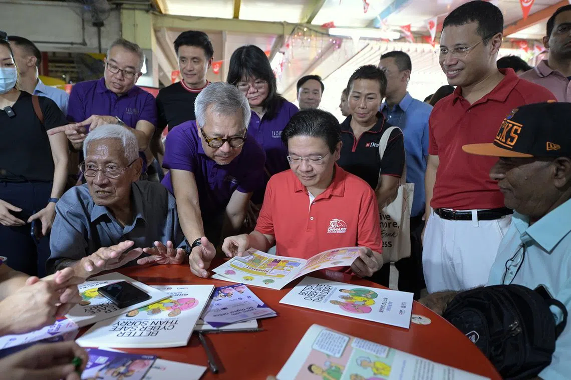 DPM Lawrence Wong (seated, third from left) and National Development Minister Desmond Lee (standing, in red shirt) with residents at a digital literacy roadshow held at West Coast Food Centre.