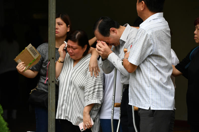 Parents of Corporal First Class (CFC) Dave Lee Han Xuan, Madam Jasmine Yeo and Mr Dennis Lee, crying before the cortege leaves the family home for Mandai Crematorium during CFC Lee's military funeral on May 5, 2018.