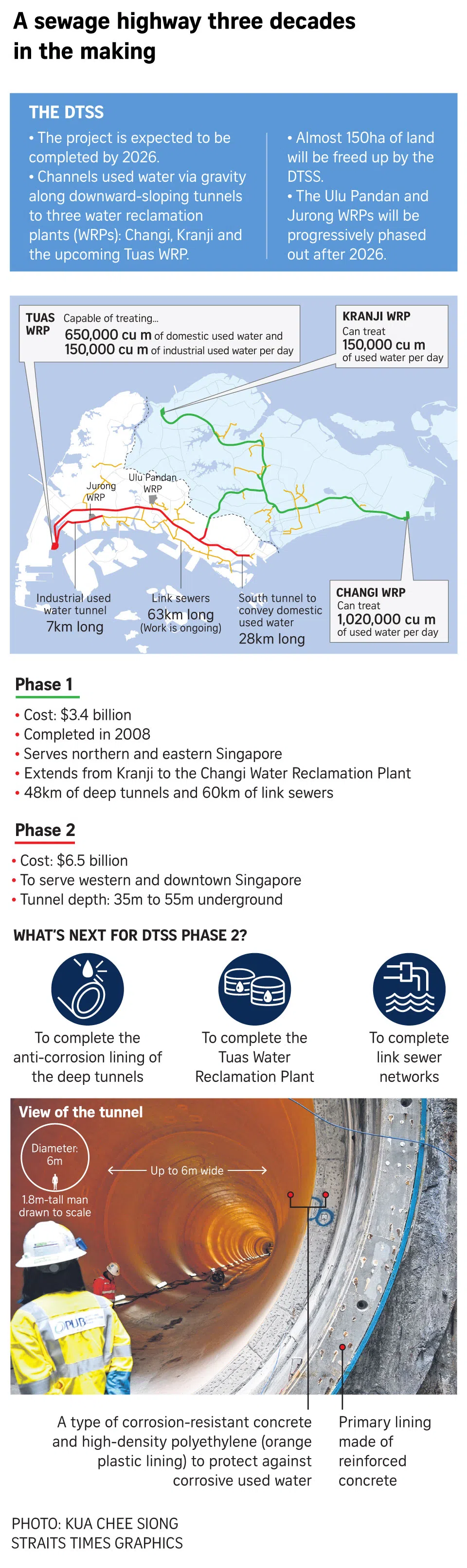 SINGAPORE – Work is almost complete on the 206km-long Deep Tunnel Sewerage System (DTSS) conceived in the 1990s, with tunnelling works done for its second phase