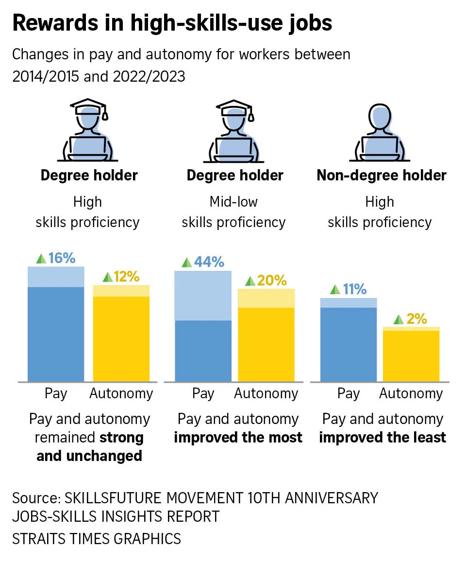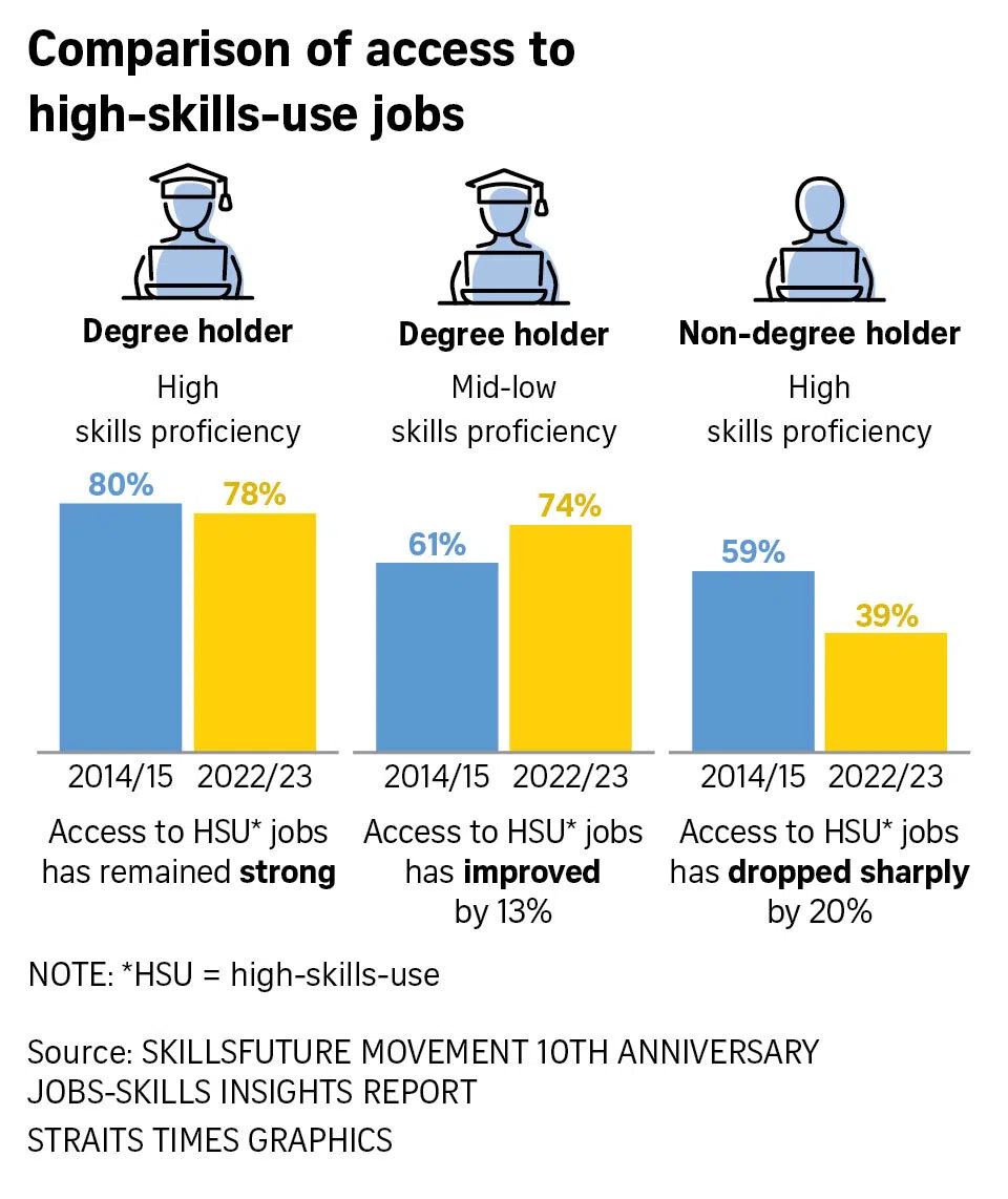 SINGAPORE – Degree holders are more likely to land jobs that require a high skill level and gain more pay than those without a degree, amid significant changes taking shape at workplaces.